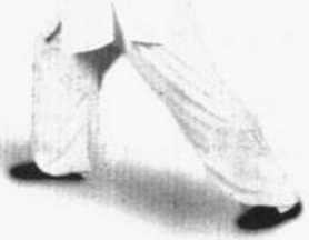 3. 右脚向前迈出一步,先脚跟着地。同时右拳渐变成掌, 向前弧形撇出,掌心朝上,五指朝前,与锁骨高,左掌由右小臂 外稍向下向里向上绕一浅半弧,停于右小臂里侧(图122)。