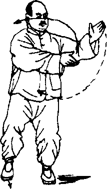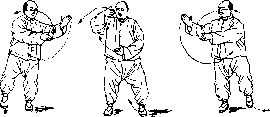 两臂运势圆满,还须注意劲路的圆转。比如右单臂运转:当 手掌向左而上,劲点在右掌拇指、栈骨和掌根一侧,有上抄之 意。当向前、向上右臂外旋移动时,劲点在拇指、槎骨和掌背一 侧,有糊、例之意。当右掌向右、向下,随着臂内旋运转时,劲 点又转到右掌小指、掌缘和掌根一侧,即有按、推和下采之意, 随即接着抄转,形成一个糊、拥、按、推、采、抄椭圆形的劲路 循环,而手抄日寸为主劲路,这样两臂同时做相反(右手为顺时 针方向,左手为逆时针方向)的运势,一上一下,一左一右,劲