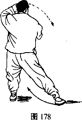 1. 左脚尖里扣踏实,身体同时直起右转,使身体转向北偏 东。随转体,右臂内旋,右肘向上、向右、向下移于右肋旁,右 拳屈肘横臂于左肋前,拳心朝下。同时,左掌自左而上弧形上举 于左额前上方,掌心朝外,眼随转体平视转移,眼神关及两手移 动。(图178)