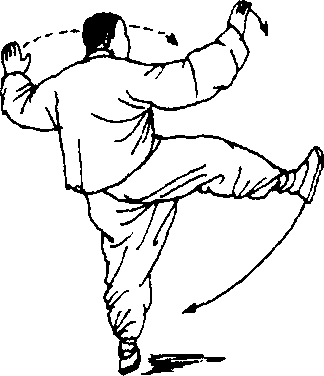 1 .左脚尖外撇踏实,腰渐渐左转,重心渐渐全部移于左腿 坐实;右脚跟先离地,右腿向前提起,右脚停于左踝旁。同时, 左掌随转体向左前上稍移,随移随着臂外旋使掌心朝里;右拳变 掌,稍内旋,自前而下向左弧形上抄,随抄随着臂外旋,掌心朝 里,与左掌交叉合抱,右掌在外。两掌高与锁骨齐,两臂呈弧 形。眼神关顾两掌合抱,向右前平视。(图189、190)
