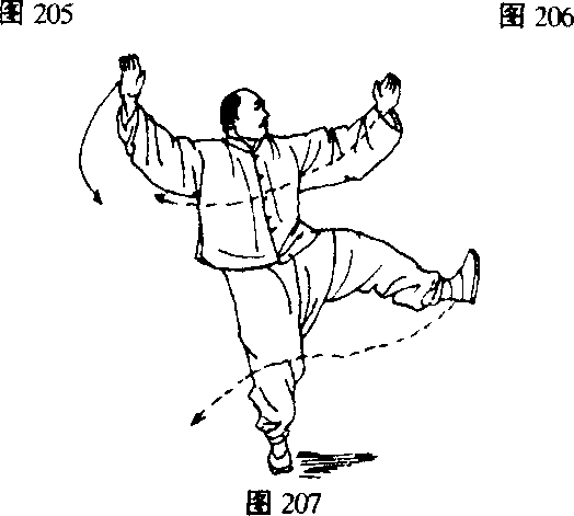 动作2与第三十七式“右蹬脚”相同,唯左右相反。(图 207)