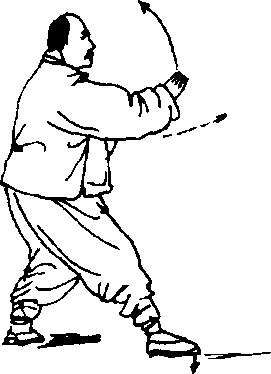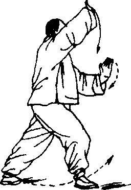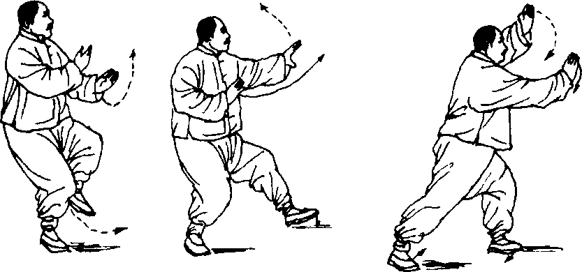 2.身体继续右转,重心渐渐全部移于左腿,右脚提回,随 体转自然移动。同时,右臂稍内旋向右捆;左掌沉肘经右小臂上 侧稍向后下抽回,眼神随右臂前视。(图270)