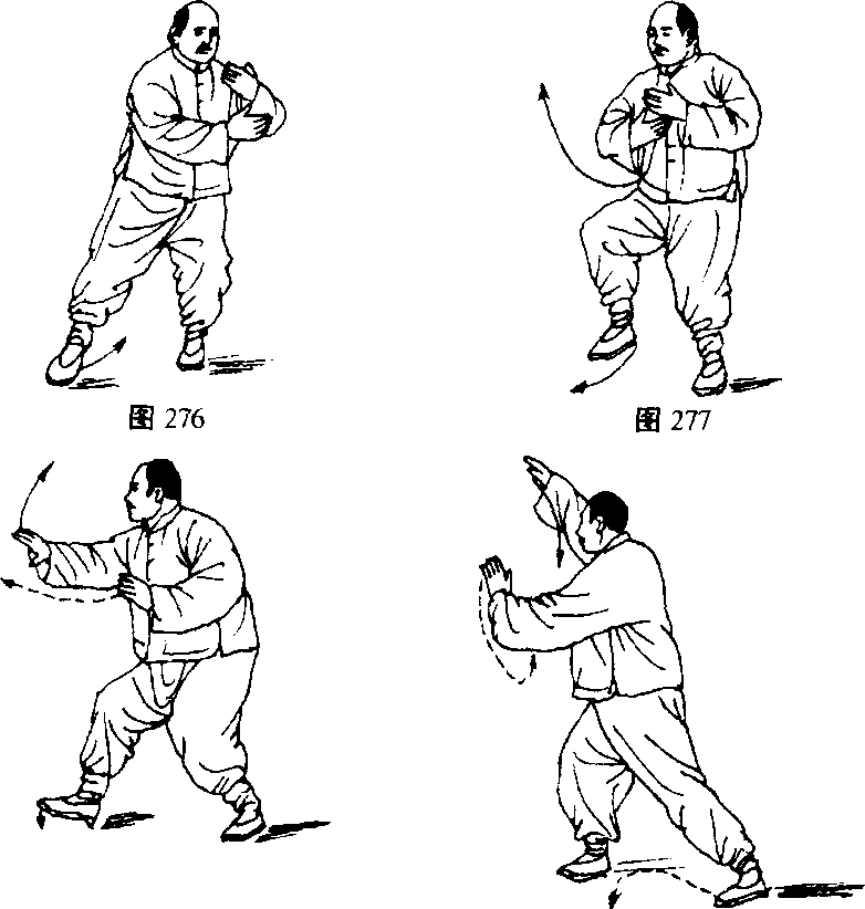 动作与前“右穿梭”相同,唯前右穿梭为东南方向,这一右 穿梭为西北斜方。(图276、277、278、279)