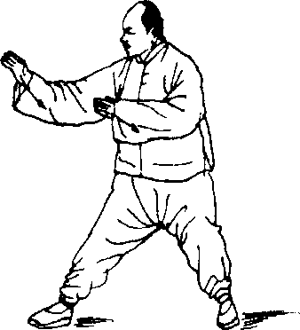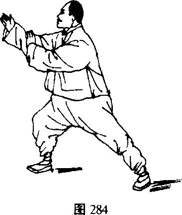 1 .重心不变,右脚尖微内扣使之朝正前方(正面),随即重 心渐渐全部移于右腿,左脚渐起,左脚尖向右至右踝内侧。同 时,右肩肘松沉,带动右掌里收于右胸前,随收随着臂微外旋使 掌心朝下,右肘稍坠,略低于腕;左掌同时随着沉肩向左下,再 向右前弧形抄至腹前,随抄随着臂外旋使掌心朝上。两掌上下相 对如抱球状,两臂呈弧形,眼神关顾右臂下沉,即向左前平视。 (图 280)