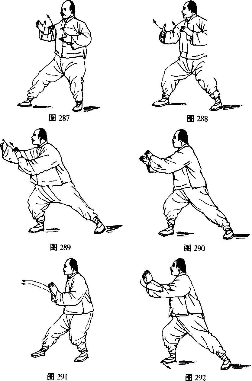 (二)右糊势、(三)搠势、(四)挤势、(五)按势动作要领 及其他均勺第三式“揽雀尾”相同。(图282 ~ 292)