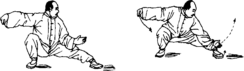 右脚尖外撇(朝南偏西约15度)踏实。随着脚尖外撇,右 胯根微里收下沉,右胯与膝随脚尖而外旋松开,膝尖与右脚尖方 向一致,腰同时微右转,重心随之微向后移。与此同时右吊手不