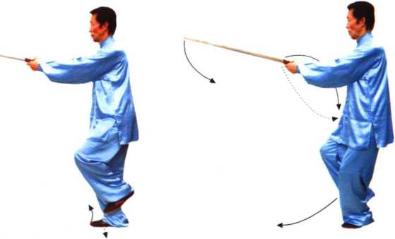 ① 左脚向前跳步,要 轻灵柔和,不可太高太 远。