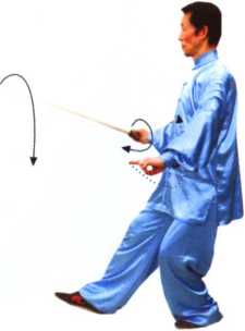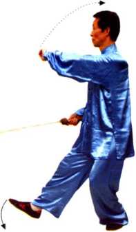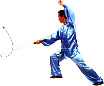 上势不停,重心前移成右 弓步;同时右手持剑向里卷至 腰部,手心向上,向前下平刺, 剑尖同膝高;左手剑指经左腰 侧向体前划弧举于头前上方, 手心斜向上,眼看剑尖。(图 125、 126)