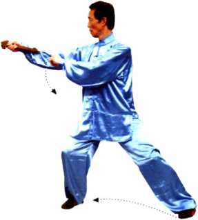 ① 左脚收至右脚内侧时,要先以脚尖为轴,脚跟向内碾步, 才能收提左脚轻灵、柔和。