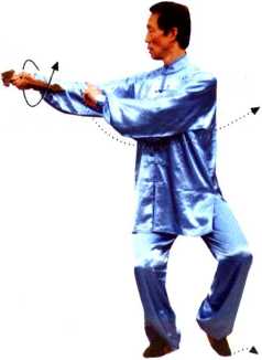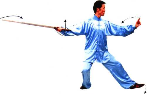 ① 右手持剑用剑柄,从后向前戳,做法是:右臂内旋带动右 腕微内扣,成立剑抽带。沉腕立剑时,右手拇指和食指握紧剑 柄,其余二指松握,才能力注剑尖。