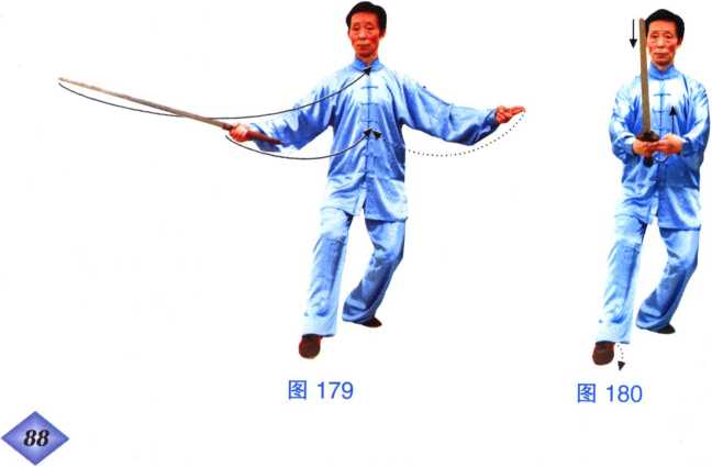 (2)摆步平扫 上势不停,右脚随向右后转体摆步踏实。重 心右移,左脚跟提起;同时右手持剑,随转体由左向右平抹;左剑 指仍附于右腕部,眼看剑身。(图177)
