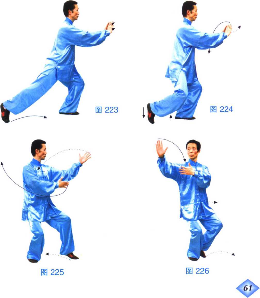 (1)跟步摆手 重心前移,右脚跟进半步(前脚掌点地),重 心后移到右腿,提左脚跟,收左脚于右脚外侧,脚尖点地;上体右 转,左手屈肘经面前摆到右肩前,手心向内,手指侧朝上;右手向 卜、向右摆到右肩侧后方,手心侧向外,手指朝上,眼看右侧前方。 (图 223、224、225、226)
