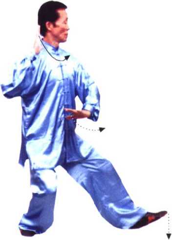 搂膝拗步是传统杨式太极拳的恚本功法之一。要求做到虚实 分明,迈步要轻灵、沉稳,身体中正,动作均匀。迈步时要先提 起大腿,蓄劲在膝,脚尖自然下垂,伸缩膝关节,缓慢迈出,脚 跟先落地,随重心前移再全脚掌踏实,才能做到“迈步如猫行”。