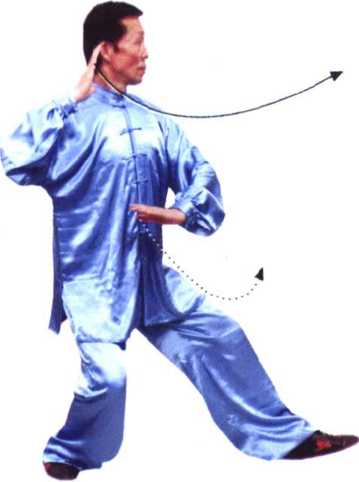 (2)虚步收手左腿迈出脚 跟着地,成左虚步;上体微左转, *手屈肘收在右耳旁,手心向而, V~指朝I:;左臂内旋左手卜落到 腹前,手侧向下,手指侧朝石, 眼看左前方。(图227)