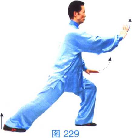 图227图227图228图228(3)弓步搂推 币心前移成左弓步;左手1诃卜、IW左搂到左 膝旁,手心向下,手指朝前;右手前推到体前,高与胸平,手心侧 向前,手指朝上,眼看前方。(图228、229)