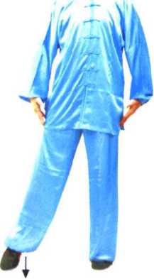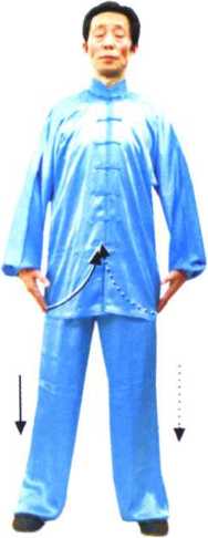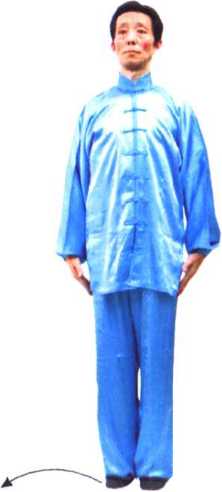 第8动:重心右移,收左脚并 步,两手下落垂于大腿外侧,还 原成预备势,眼看前方。(图17、 18)