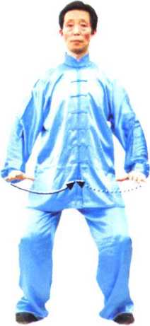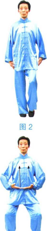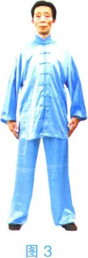 第1动:左脚开立与肩宽,两腿屈蹲;眼平视前方。(图2、3、4)