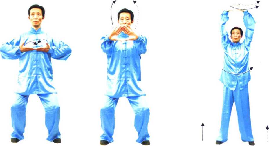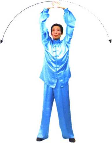 第6动:两手从两侧上合至头 顶,手心向左,食指和拇指相对, 眼看左前方。(图14)