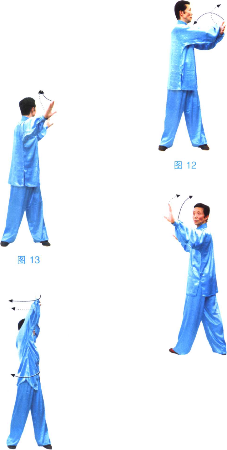 (图13正面图)(图13正面图)第6动:两手从两侧上合至头 顶,手心向左,食指和拇指相对, 眼看左前方。(图14)第6动:两手从两侧上合至头 顶,手心向左,食指和拇指相对, 眼看左前方。(图14)第5动:两腕随臂撑圆,上提 至胸前;臂外旋两手亦撑于体两 侧,手心斜向外,手指侧向上, 眼看左手。(图12、13、13、13 正面)