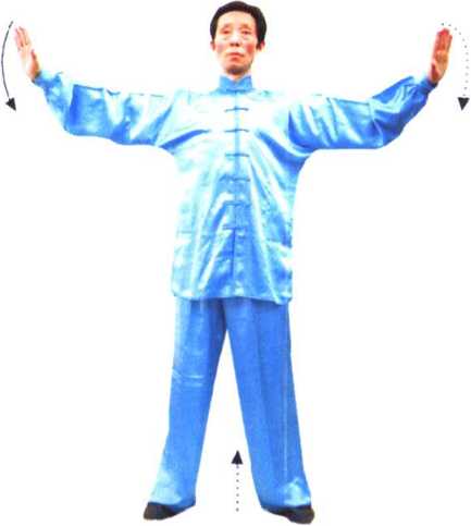 第7动:上体向右转体90度, 两手左右下落成侧平举,手心向 外,手指朝上,眼看前方。(图 15、 16)