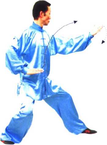 右前方(约30度)慢慢踢出,脚 面展平,高与腰平,同时两掌随 臂内旋经面前向右侧方和左侧方 弧形分撑,掌心均侧朝外,腕与 肩平,右臂与右腿上下相对,眼 看右掌方向。(图256)