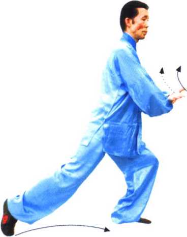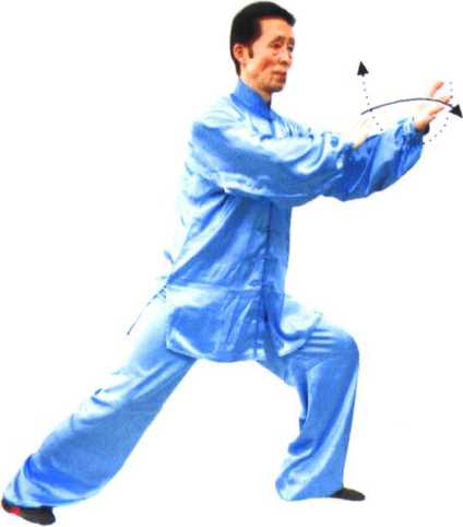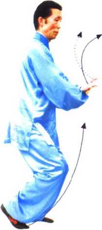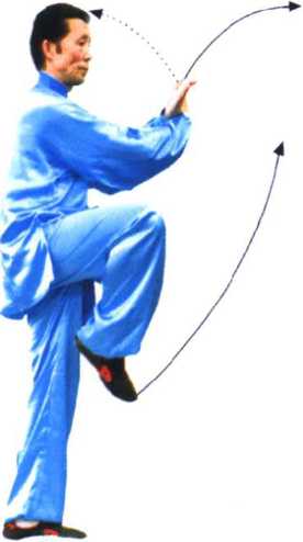 (4)提膝提掌 左腿渐渐 直立站稳,右腿屈膝提起,脚尖 自然下垂;两臂撑圆带动两掌上 提至胸前,两掌手心向内,眼看 右侧前方。(图255)