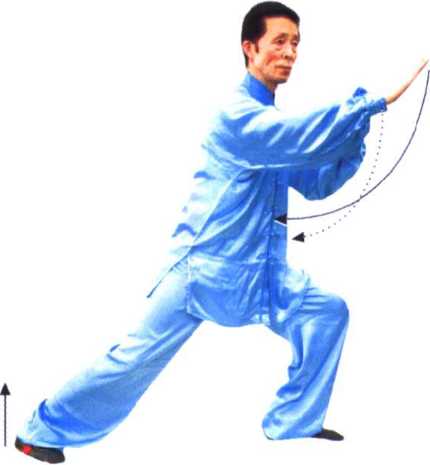 (3)收脚合抱 右脚收至左脚内侧,脚尖点地;同时随上体 微下划弧至腹前,与左腕交叉合抱,手心侧向上,右掌在外,眼看 右前方。(图253、254)