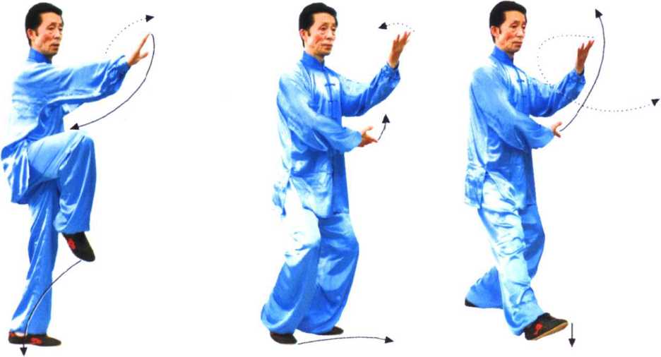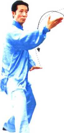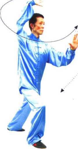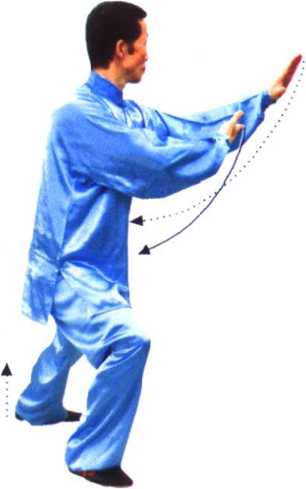 ③ 穿梭动作,一手搠架于头上方(做护头状),另一手向前推 按,均要求掌随臂内旋而动,要两臂上下相吸相系,要求架推与 弓步协调一致,连贯圆活,一气呵成。