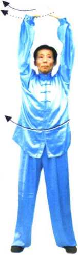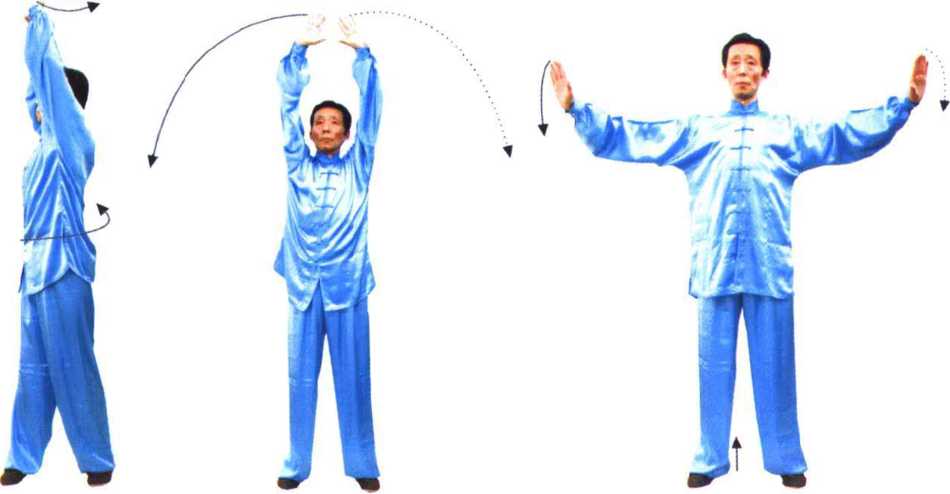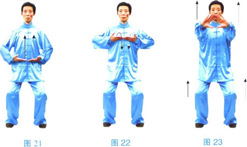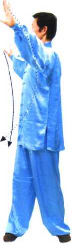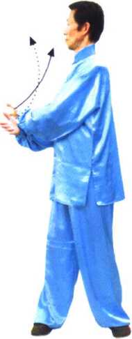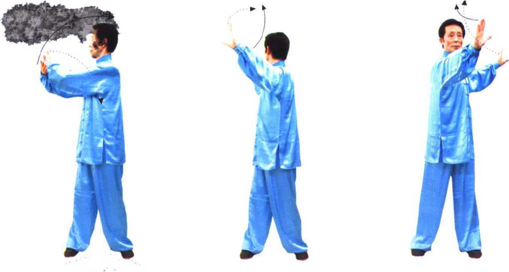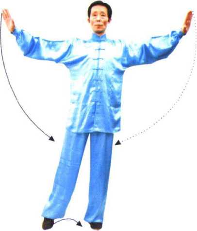 ② 无论是上体左转或右转,都是以腰为轴来带动肢体运动。 上肢无论是上提、下落、分开都要略带弧形,就是用小臂的外旋 或内旋来带动两掌完成弧形运动。