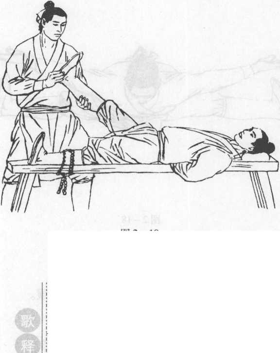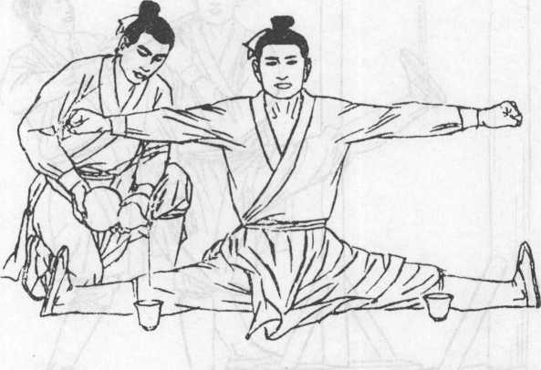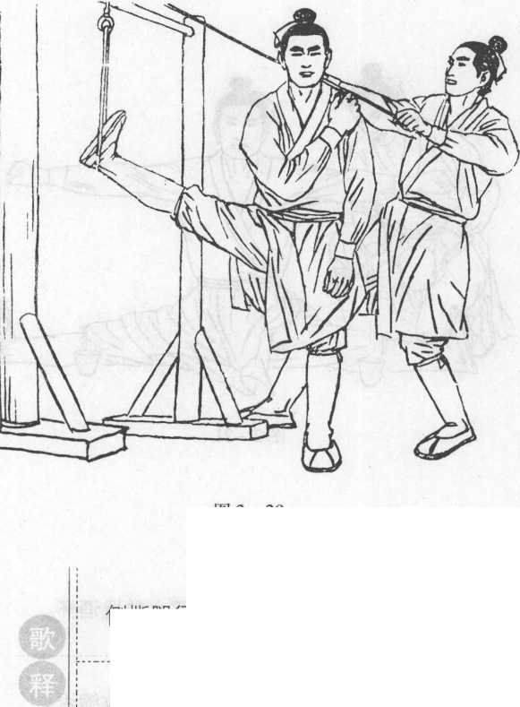 图说武当嫡派功夫真传图 2-19正撕腿须仰卧凳,且抬一腿让人扶。锁稳左腿手垫腰,上抬之腿正面撕。【动家秘法宝瀛)腿基功第二侧撕腿精图秘说之二十中华武术绝学0 2-20侧撕腿须抬一腿,担在悬桩绳套中。且教脚尖勾起时,助手拉索向上升。【雁门神形枪】图说武当嫡派功夫真传腿基功第二贴地一字耗腿精图秘说之二十一【功冢糠法案藏】图 2 -21贴地一字耗腿功,双膝之前置酒杯。杯装水满耗腿力,可试下盘收缩否。