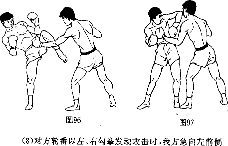 我即用左臂 外侧下砸开其来拳,随即以右摆时横击对方前额、太阳穴,再 右拧腰用左撬肘撬击其颗侧(图94、95)。或左摆肘猛击其面 部》图94图95图94图95(7)当对方跨步上前伸右手抢抓我方衣领,并挥动左勾拳 攻来时,我即向右侧拧腰提左膝抵挡,随即以左挑肘挑击对方 下巴、喉结,再迅速右转身挥右反肘撞击其后颈或太阳穴、耳 根(图 96、97)。图98 图99跨步闪进,乘对方重心不稳,暴露空当时,即复以右切肘猛切 击其下颔、心窝,再迅速右转身续发左摆肘横击对方喉结(图 98、99屋