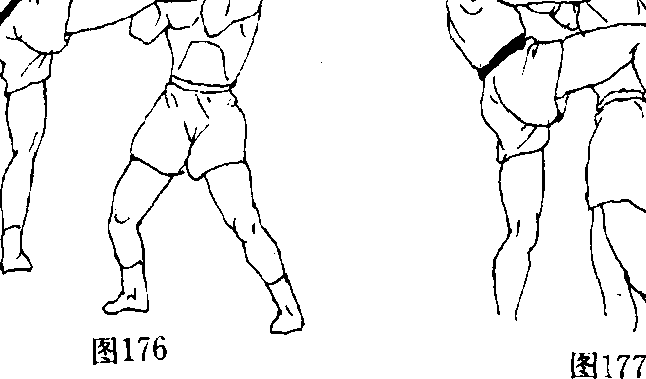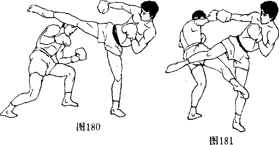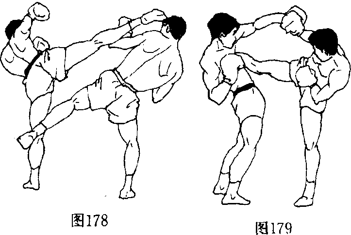 (2)当对方以右脚高扫踢进攻时,我方用左手外挡其高 腿,左脚同时朝对方大腿或膝部内侧割踢,左脚落地时,即扬 起右脚扫踢其肋腰部(图178、179)。