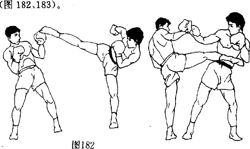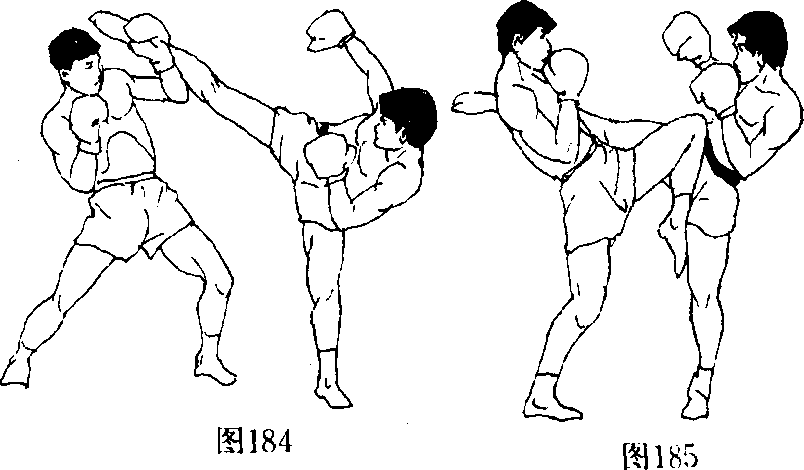 (5)当对方猝然发出右脚高扫踢,即用拳臂护头,随即抛 左膝撞击敌胃部、小腹(图184J85)。或以右脚蹬踢其腹部、