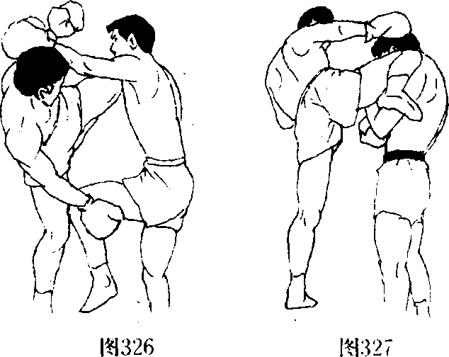(2)如(图326、327)所示用高位侧膝攻击。