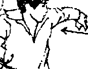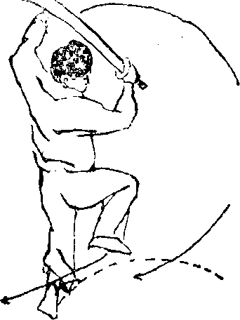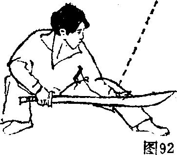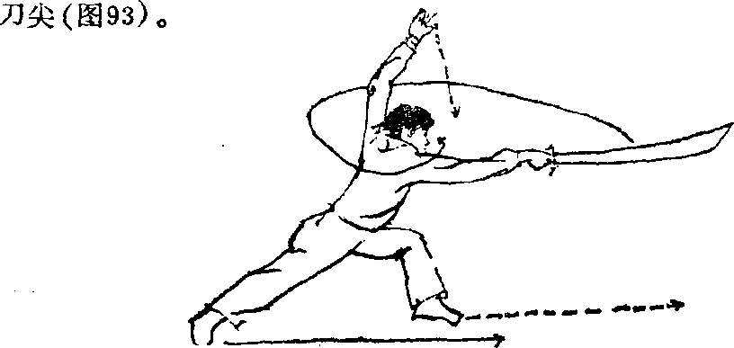 ①左脚蹬地,右脚前跨落步,隨之左脚向前落地成左弓 步:左掌屈时插于右腋下,右手持刀(刀尖朝下)使刀背顺左 肩向后缠绕,左手向左侧方平摆(图94)。