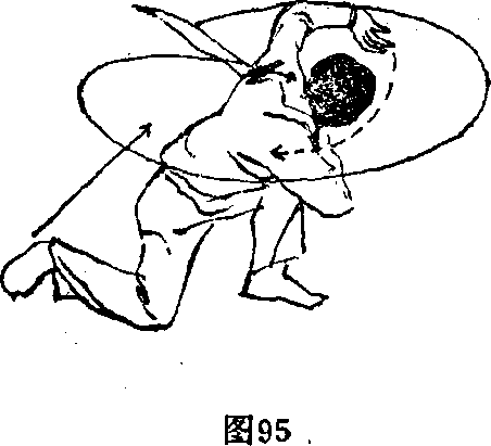 ①左掌下插于右胁处,上体向右后方拧转,右手持刀, 竽臂内旋,手心朝下,将刀向右后平行横扫,至身后时,臂 外旋(手心朝上),屈肘,力尖略垂,由后向左肩处绕行;右 膝随右转之勢自然上提;同时,左掌向外分开,再由体前回 抄于右胁处(图96)。