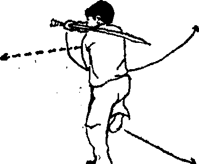 上体略起,后腿伸直成左弓步I左手上架于头上方,右 手持刀,由腰际向前直臂刺出,刀尖朝前,刀刃朝下,目视