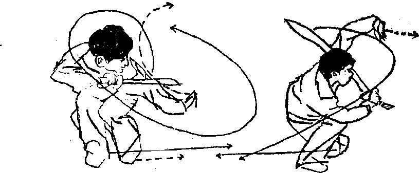 至身后时,臂外旋,手心朝上,刀尖下垂,刀背贴背从右后