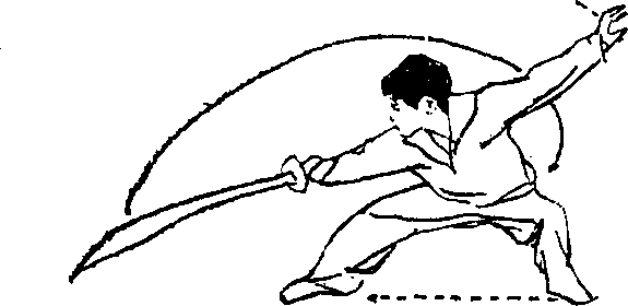 步I同时,右手持刀,手心朝下,随体转之势向右后横扫,