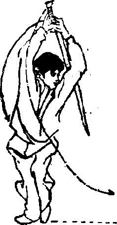 紧接上势。左脚向左上步,右脚向左脚后插步I右手持 刀(刀尖朝下)使刀背顺左肩外侧向左向后至右肩时向左胁 下平扫,刀至左胁时,右臂内旋,手心朝下,刀身平放,刀 尖朝后,左掌上架于头上方;目视左方(图131)。