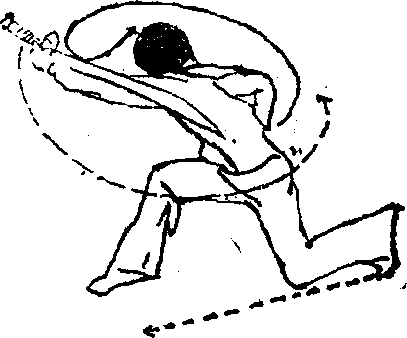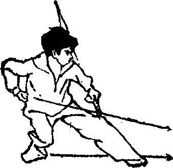 ①右脚向右撤步,体上 右转《右臂外旋,拳心向 上,经瞍前向右后方拉回, 左手握刀,随转体之势由下 向右上方摆动> 目视右后方 (193图)0