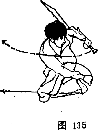 ②动作不停,右脚由左 腿后插步;右手握拳鈐胸前 向左下方冲出,左手抱刀, 下垂于左后方> 目视左下方 (图 135)。