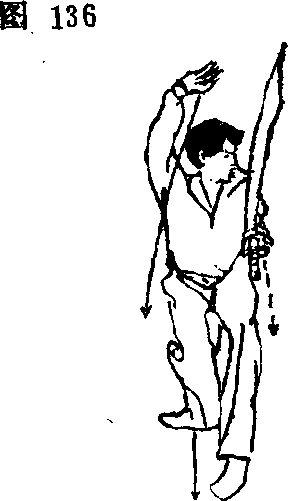 ②动作不停,上体左转 ,左脚右挪,脚尖点地成左 虚步I左手抱刀,从上向下 放于左腰际,手心朝上,右 拳随转体之势由后向右上方 横架,目视左方(图137)。