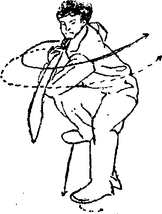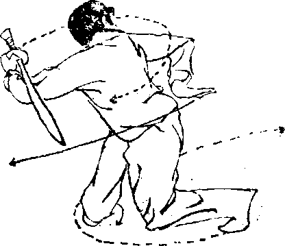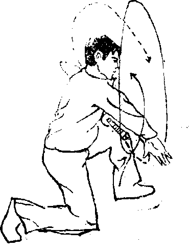 七动#米停,:右臂先' 内旋再外砀,遂时针方 由左经上向右下朝左肋处 抄掌,左手抱刀,经左膝 邮左上方绕挂,至左前上 方时,