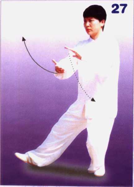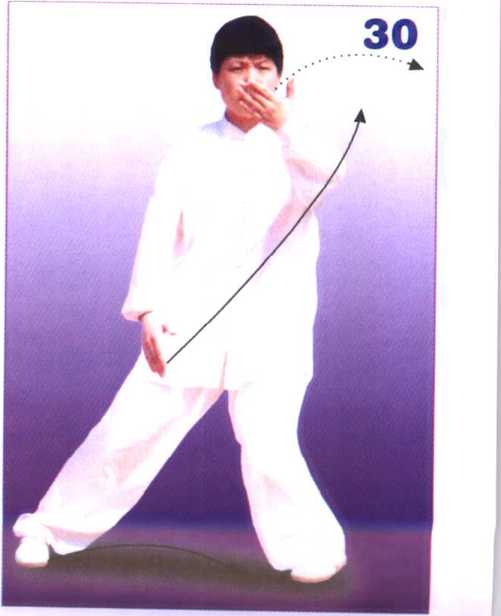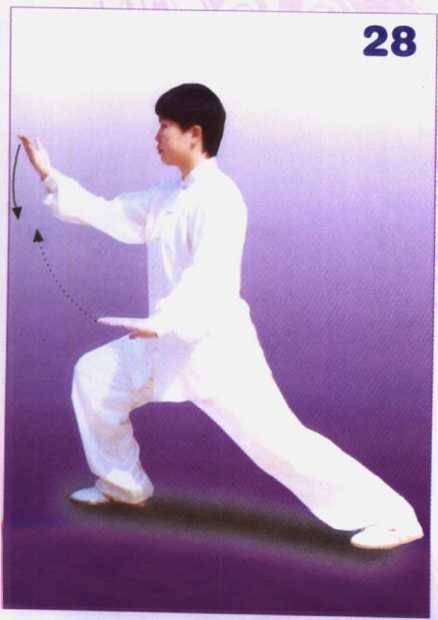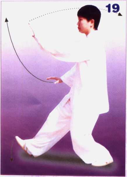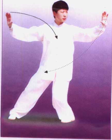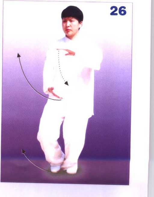 (1) 左腿慢慢屈膝,上体后坐, 身体重心移至左腿,右脚尖翘起; 然后身体左转,右脚尖内扣,身体 重心再移至右腿,左脚随上体左转 收至右脚内侧,脚尖点地;同时右 手向上、向左划孤,屈臂平举于胸 前;左臂外旋,左手向右、向下划 弧收于腹前,使两掌手心上下相对 成抱球状;眼看右手(图19、20、 21)。