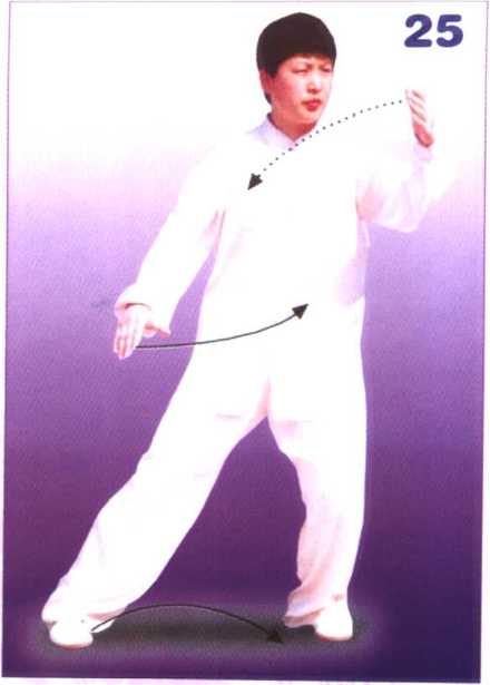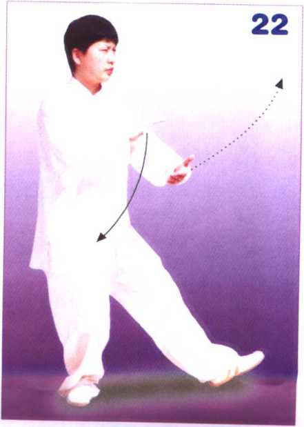 (2) 左脚向左前方迈出一步, 上体左转,重心前移成左弓步;同 时左右手随转体慢慢分别向左上右 下分开;左手高与眼平,手心斜向 上,肘微屈,右手落于右胯旁,肘 也微屈,手心向下,指尖向前;眼 看左手(图22、23)。