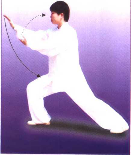 【要点】上体不可前俯后仰,胸部必 须宽松舒展;两臂分开时要保持弧 形;身体转动时要以腰为轴,弓步 动作与分手的速度要均匀一致,弓 步两脚跟横向距离应保持约10?30 厘米。