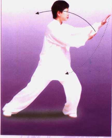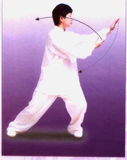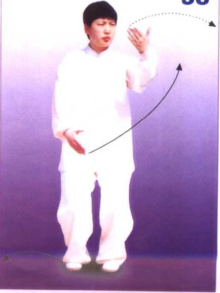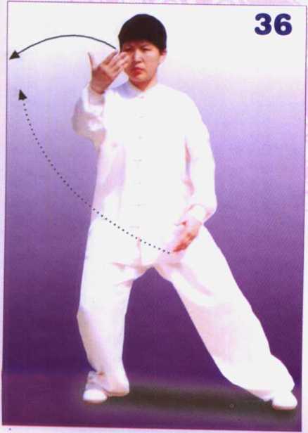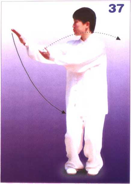 同时右手经脸前向右立圆云转,至 身体右侧时,向外翻掌成平举,手 心斜向下;左手向下经腹前向右立 圆云转至右肩前,手心斜向内;眼 看右手(图36、37)。