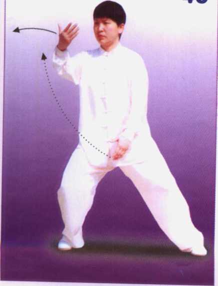 (4) 上体左转,重心移至左腿, 右脚向右侧横跨一步,脚尖向前; 同时随身体左转,左手经脸前向左 立圆云转,至身体左侧时,向外翻 掌成平举,手心斜向下;右手向下 经腹前向左立圆云转至左肩前,手 心斜向内;眼看左手(图38、39)。