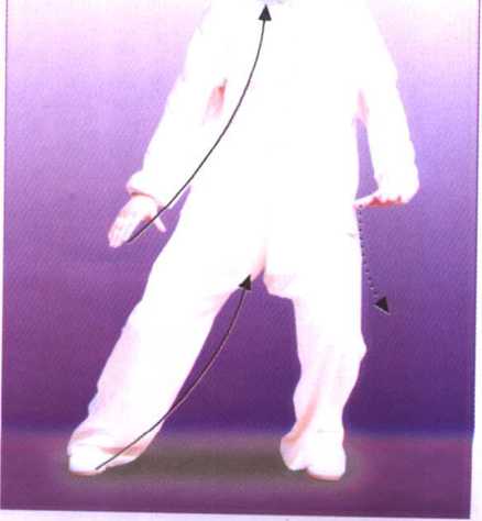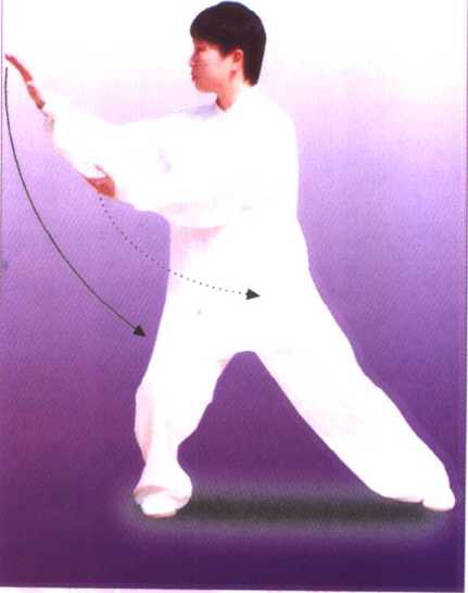 (I) 上体左转,身体重心移至 左腿;同时左手向内翻掌,随身体 左转向左划弧至身体左侧,手心向 下,指尖向前;右手屈肘下落于右 腿外侧,手心向下,指尖向前;眼 看左手(图42)。